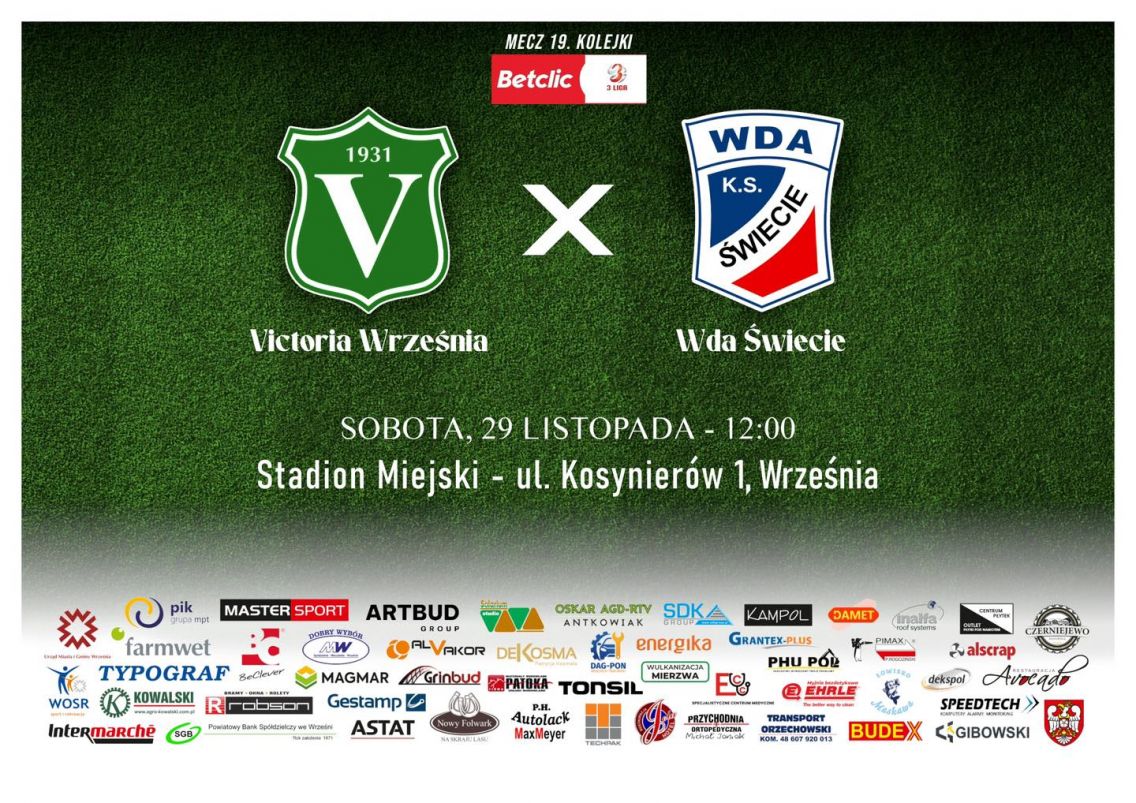 Betclic 3 liga Victoria Września - Unia Swarzędz 25.10.2025 15.00 Września Proton B klasa Sokół Damasławek - Victoria II Września 26.10.2025 14.00 Damasławek 1 Liga Okręgowa Junior B1 Victoria Września - Polonia Golina ...