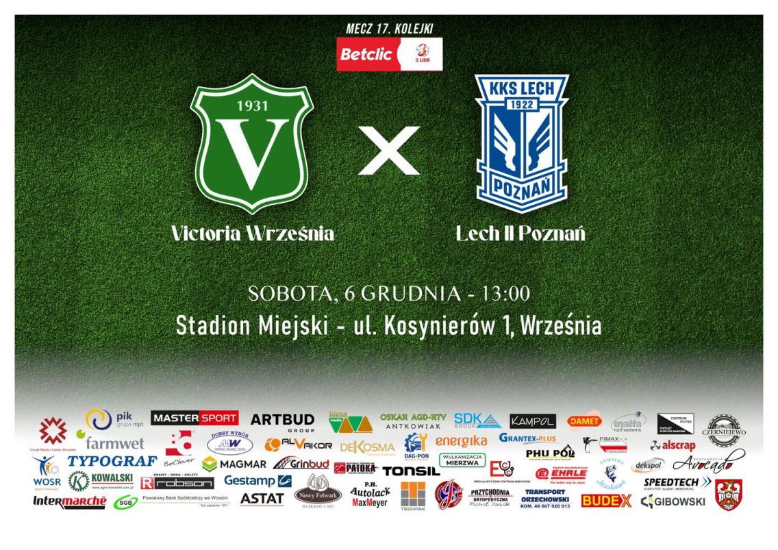 Betclic 3 liga Lipno Stęszew - Victoria Września 8.11.2025 12.00 Stęszew 2 Liga Wojewódzka Junior B2 Victoria Września - Rawia Rawicz 8.11.2025 14.00 Września 2 Liga Wojewódzka Trampkarz C1 Victoria Września - UKS APR LAMPART...