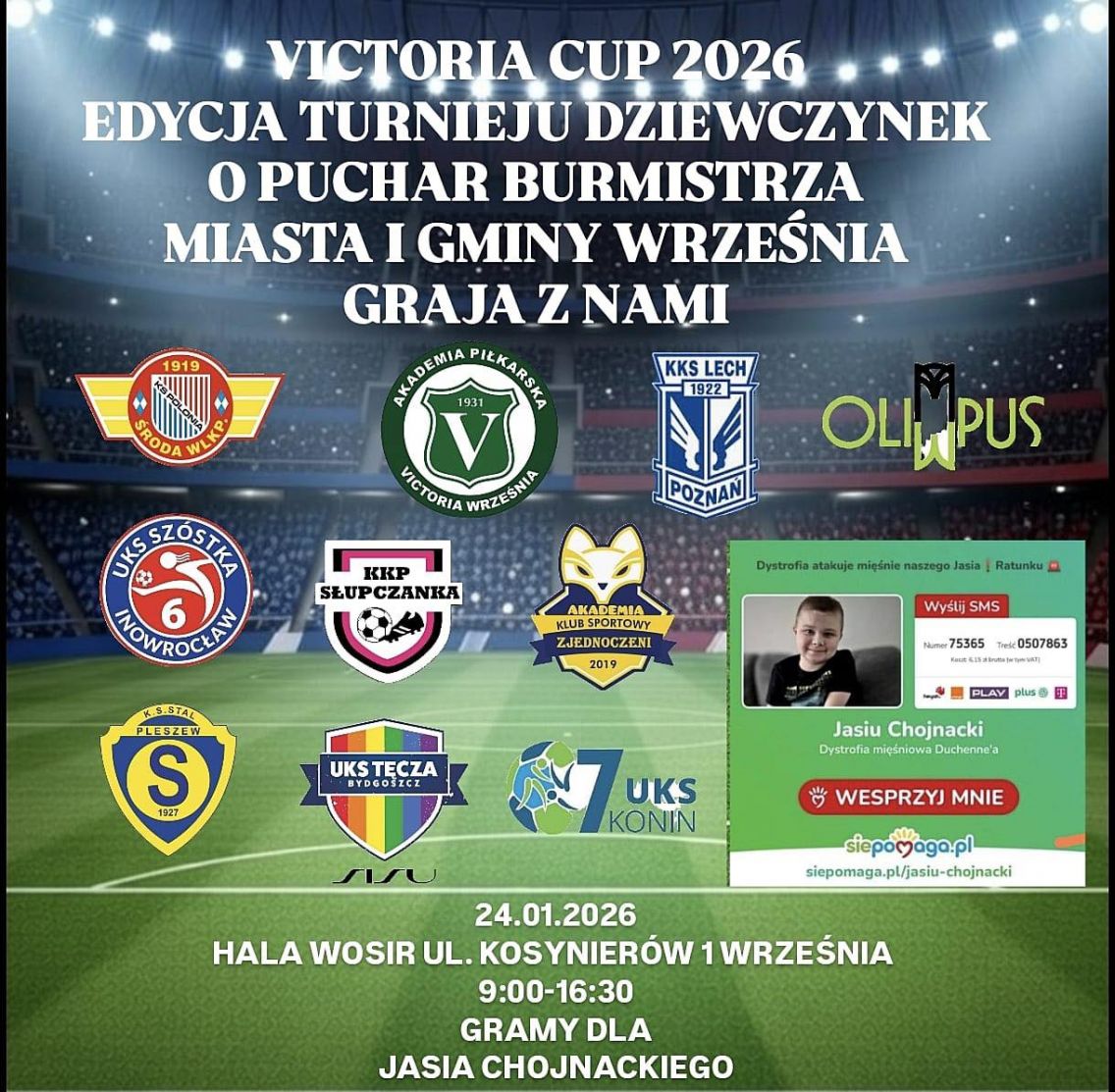 Serdecznie zapraszamy w sobotę 24.01.26 wszystkich sympatyków kobiecego futbolu oraz naszego Klubu do wsparcia zespołu dziewczyn w II edycji Victoria Cup- halowego turnieju o Puchar Burmistrza Miasta i Gminy Września.